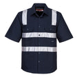 100% Cotton Short Sleeve Regular weight business shirt with tape.,Double breasted pockets, both with pen division.,Plastic button closure.,HiVisTex reflective tape around body and over shoulders. 2 pockets for secure storage 100% Cotton fabric for added comfort and breathability Premium reflective tape for increased visibility Pen division Button front closure 50+ UPF rated fabric to block 98% of UV rays Available in sizes from XS to 5XL